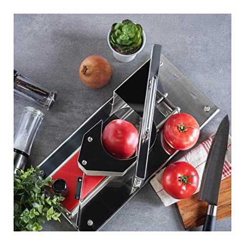 Een hoge productiviteit door snel en effectief werken garandeert de ergonomische handgreep op de glijrails. Met weinig inspanning wordt de gewenste groente of fruit door het inzetstuk van het lemmet geschoven. Je ontvangt perfect gesneden schijven. De tomatenscheder is gemaakt van hoogwaardig roestvrij staal. Daardoor en dankzij de eenvoudige verwijdering van de snijset kan de tomatensnijder eenvoudig en snel worden gereinigd.