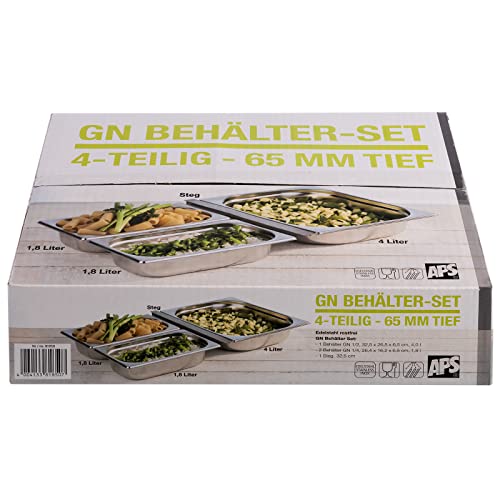 Specification: APS GN container set, 4-delig roestvrij staal bestaande uit: – 1 GN 1/2 container, 4 liter 32,5 x 26,5 cm, diepte: 65 mm…