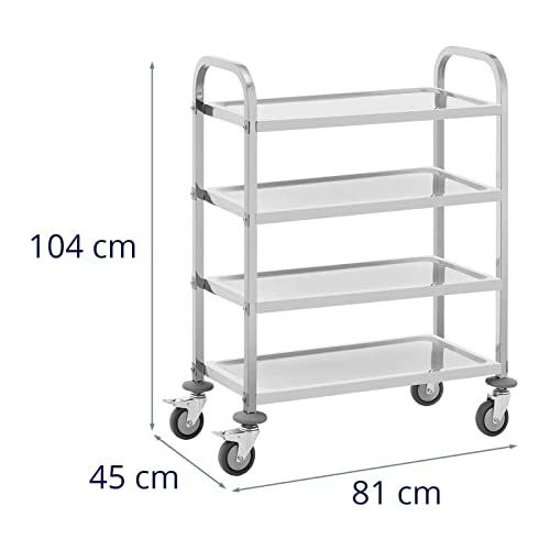 De serveerwagen van hoogwaardig roestvrij staal draagt tot 108 kg. Op 4 lichtlopende stuurwielen – 4 daarvan met rem – verplaats je in kantines, grote keukens, restaurants of openbare instellingen eten, dranken of servies snel en stil naar de gewenste plaats. De 4 gemakkelijk toegankelijke niveaus met 69 x 39,5 x 3 cm bieden daarbij voldoende ruimte voor grote hoeveelheden levensmiddelen, opslagartikelen of porselein.