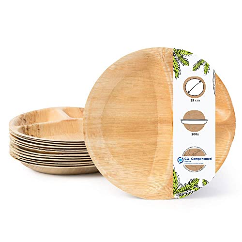 Inhoud: 200 stuks ronde wegwerpborden van palmblad met een diameter van 25 cm en 3 aparte kamers